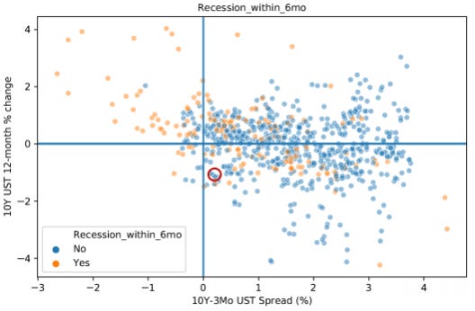 My takeaway from this chart is that the top-left quadrant is the most dangerous situation (the curve un-inverting itself as the 10-year rate rises). With this in mind, the present situation doesn't look too precarious. An interesting possibility going forward is that we could move into the bottom-left quadrant, since the Fed is unlikely to hike up the short-end of the curve. The 10-year rate could dive and cause the curve to re-invert. In that case, we would largely be in uncharted waters.