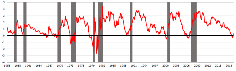 The y-axis is the spread between the 10-year treasury rate and the 3-month treasury rate. A common misconception is that yield curve inversion coincides with recessions, even though historically the yield curve can un-invert some time before a recession actually begins.